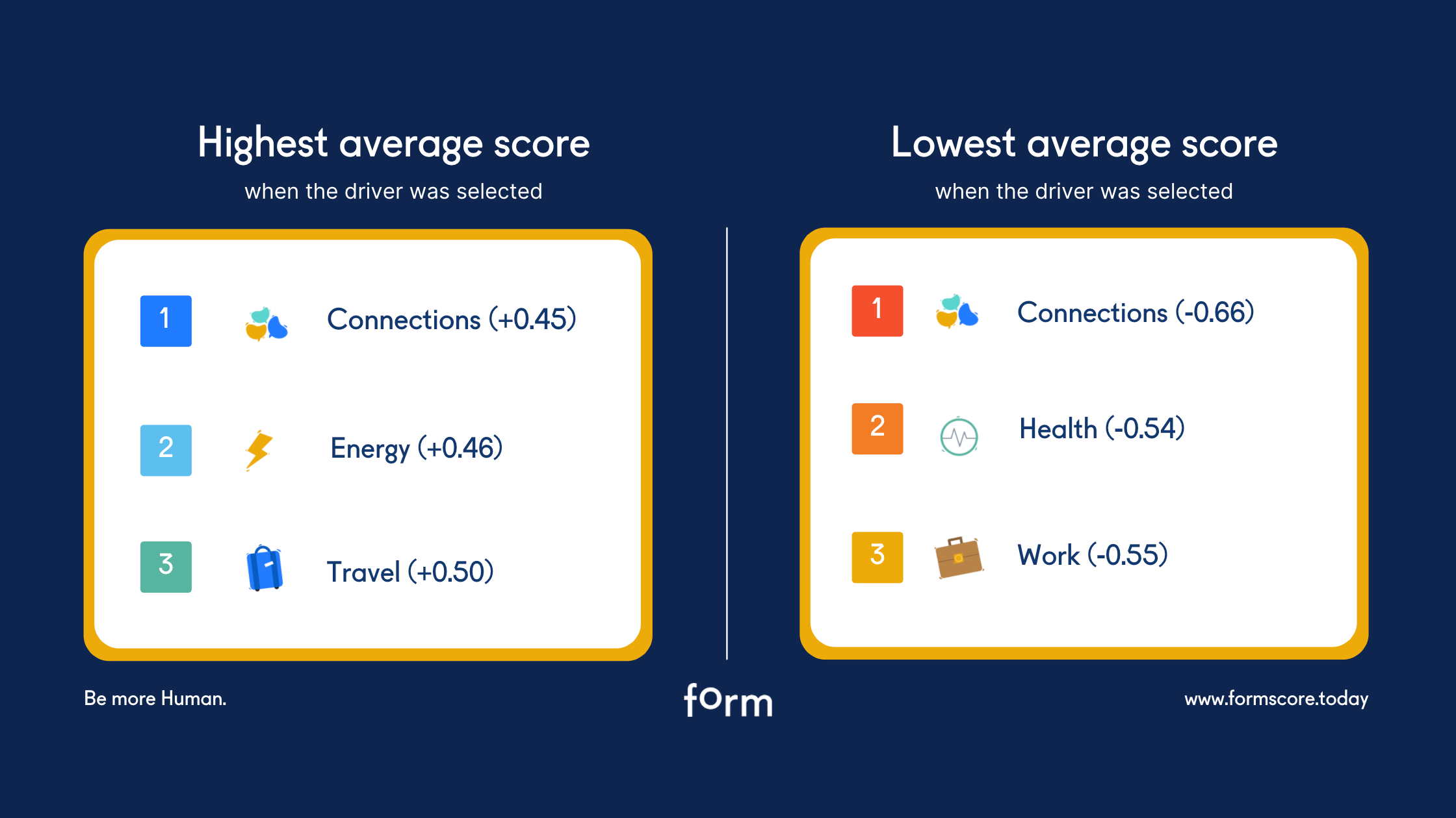 Connections, Energy and Work had the most boosting significance when it comes to the direction of movement (average trend) in a Formster’s score.